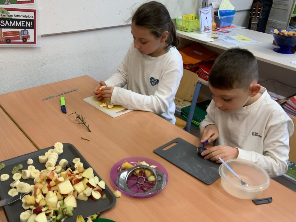 Am Freitag wurde es dann kulinarisch: In den Klassenzimmern wurden die frischen Zutaten vorbereitet. Es wurde fleißig geschält, geschnitten, gerührt und angerichtet. Die Kinder halfen sich gegenseitig, achteten darauf, vorsichtig mit Messern umzugehen, und hatten großen Spaß bei der Zubereitung.