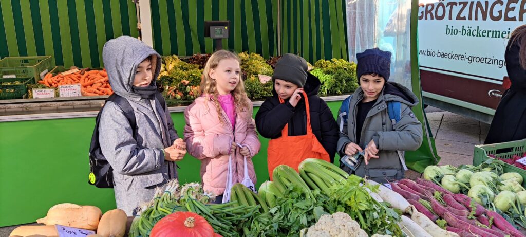 Am Mittwoch war es endlich so weit: Alle zweiten Klassen unserer Schule machten sich gemeinsam auf den Weg zum Wochenmarkt. Dort erwartete die Kinder ein besonderes Erlebnis – sie durften frisches Obst und Gemüse für ein gemeinsames Kochprojekt einkaufen.